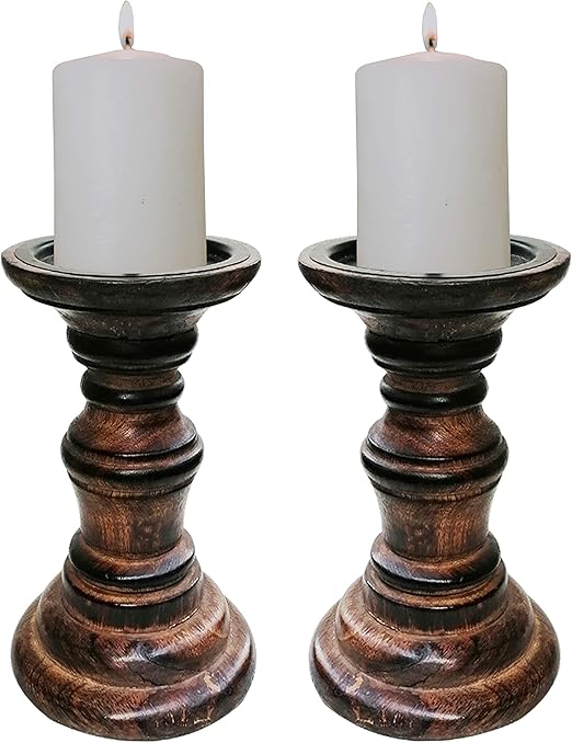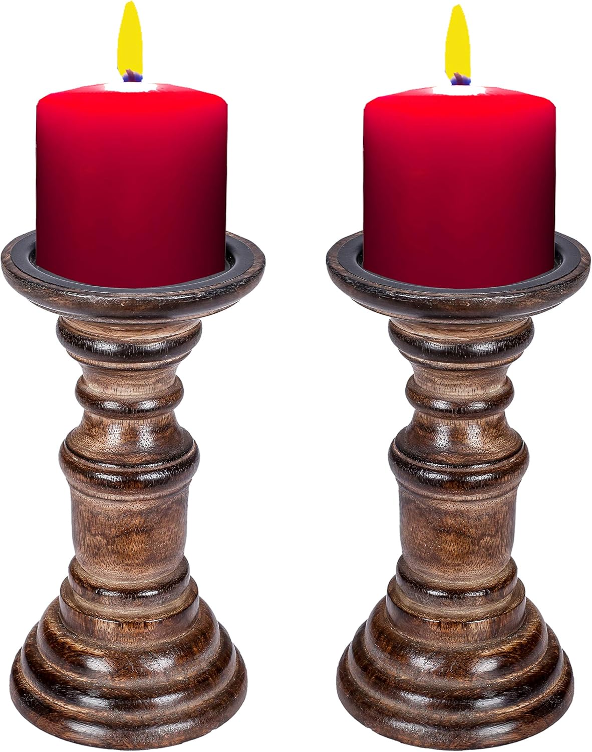 Red Wooden Pillar Candle Holders - Rugsotic Carpets Handmade Wood Eco Friendly Traditional Medium Burnt Set Of Two Pillar Candle Holder / Each pillar candle holder can accommodate 1 votive or pillar candle.